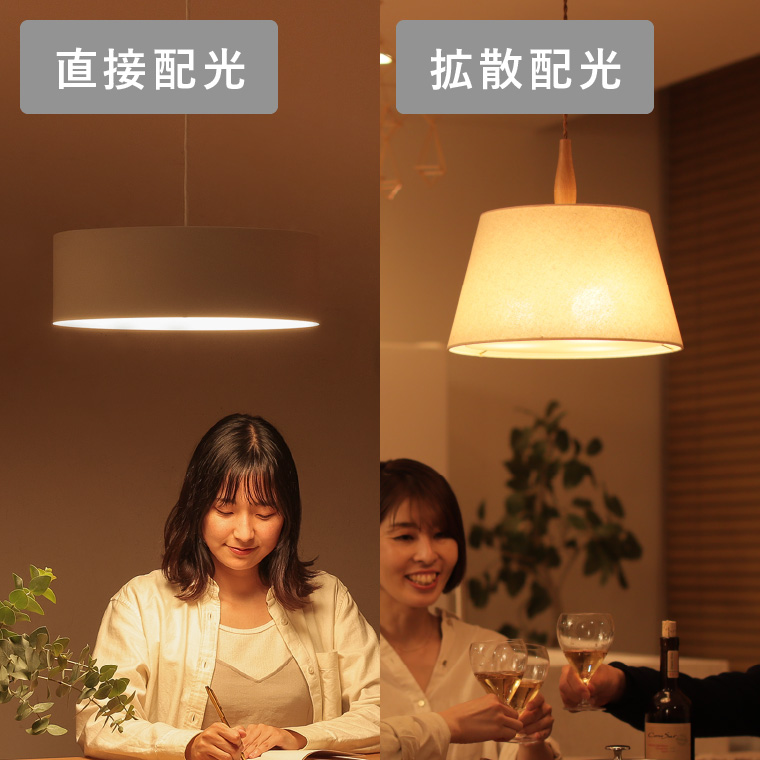 手元に光を届ける「直接配光」と部屋全体をやわらかく照らす「拡散配光」を使い分けることで、奥行きのある立体的な空間が生まれ、広がりと心地よさを感じられます。