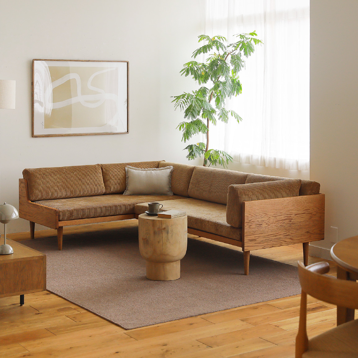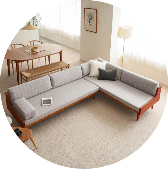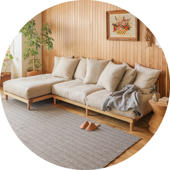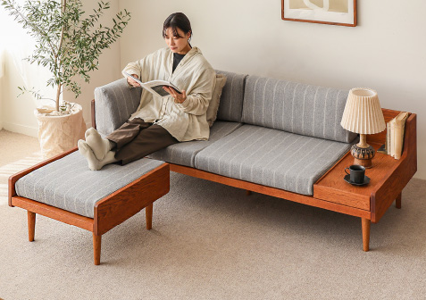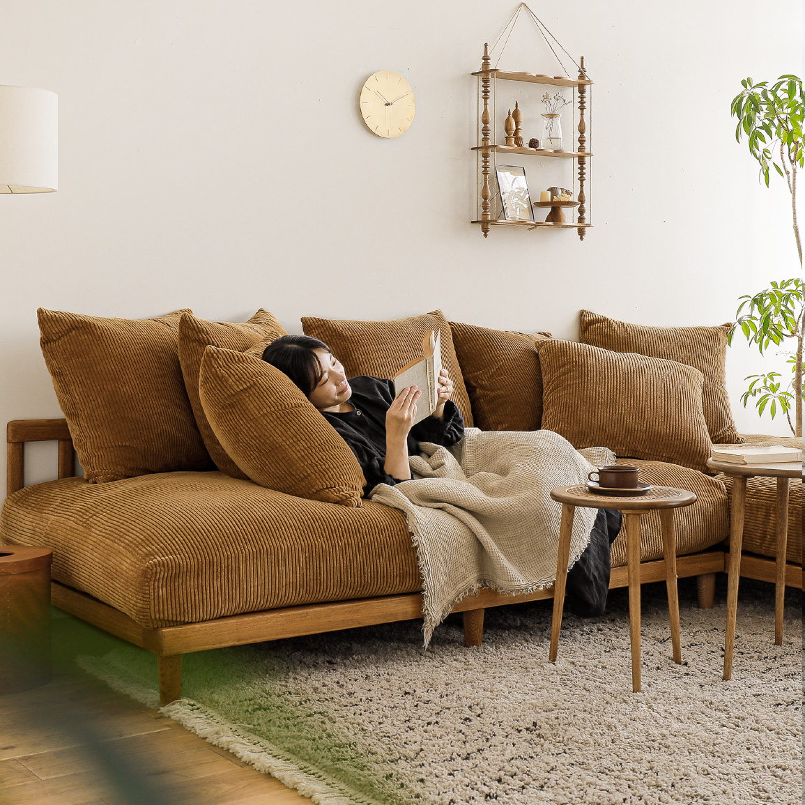 Corner sofa間取りに合わせて「1.5人掛け+コーナー+3人掛け」のような片側に伸びたL字ソファーとしても、贅沢な座り心地を実現できます。カウチソファーのように脚を伸ばして座る場所が出来ますので、みんなで映画を見るのにも快適に過ごせるでしょう。