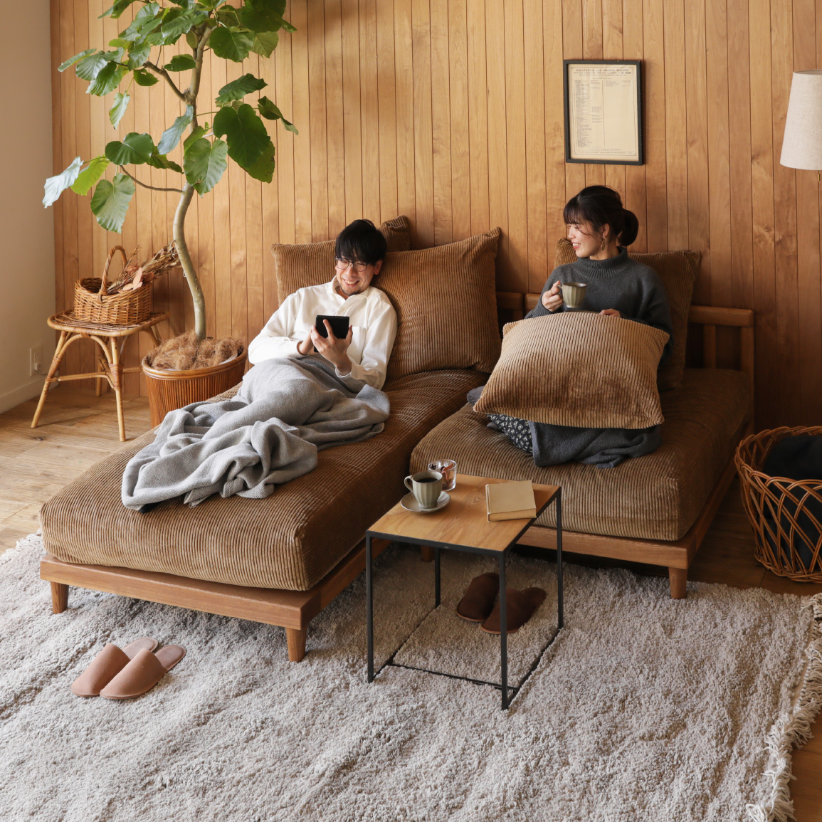 Couch sofa1〜3人でゆったりとくつろげるサイズ感。ソファーの過ごし心地がリッチになるカウチセットです。大勢で座れるのはもちろんですが、大人2人がそれぞれに寝転べるのも魅力。お互いのスペースを気にすることなく、休日のくつろぎ時間をゆったりと過ごせます。