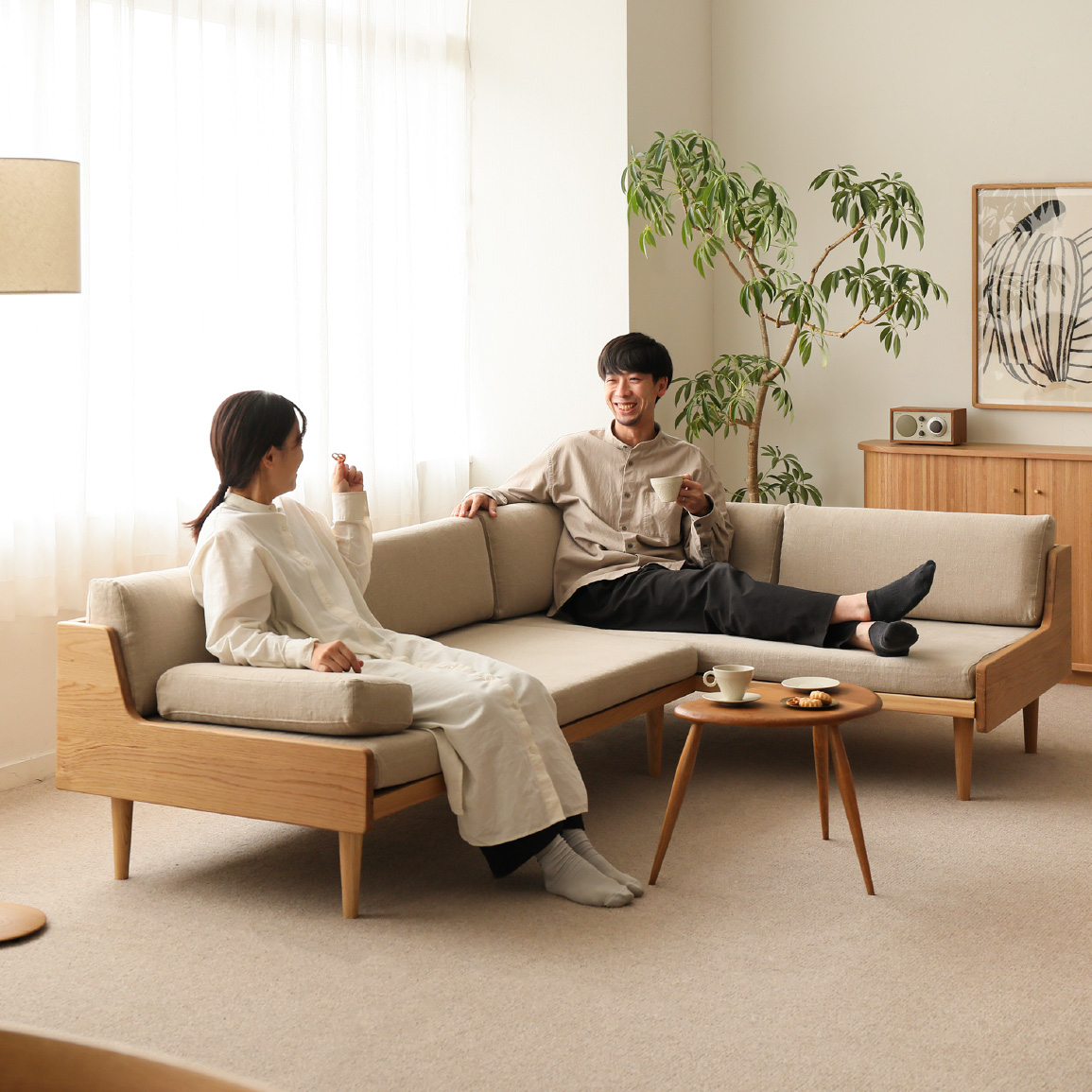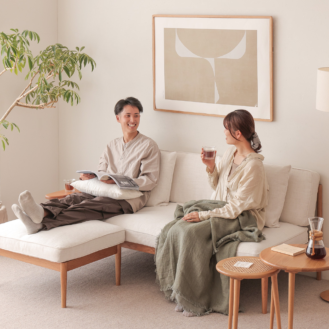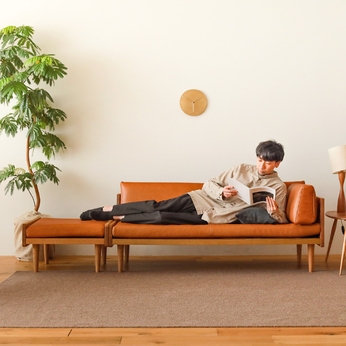 Couch sofaコンパクトだけど豊かな居心地が魅力。それぞれの場所でゆったりと過ごせるカウチソファーです。2人暮らしや、ご夫婦と小さなお子様のような家族構成のご家庭におすすめなサイズ感で、十分に広い座り心地。さらに、脚を伸ばして座れるので、カウチならではのリラックス感も楽しめます。
