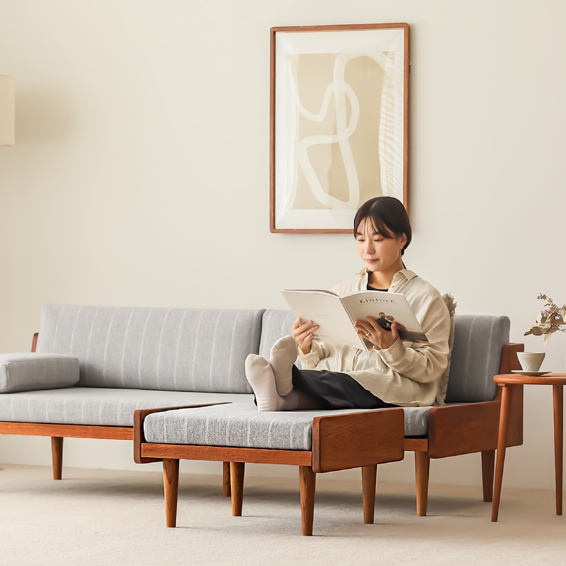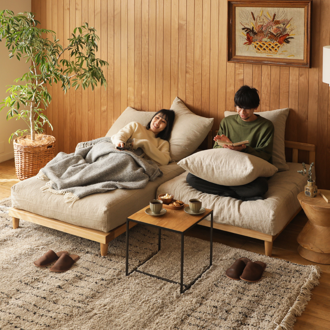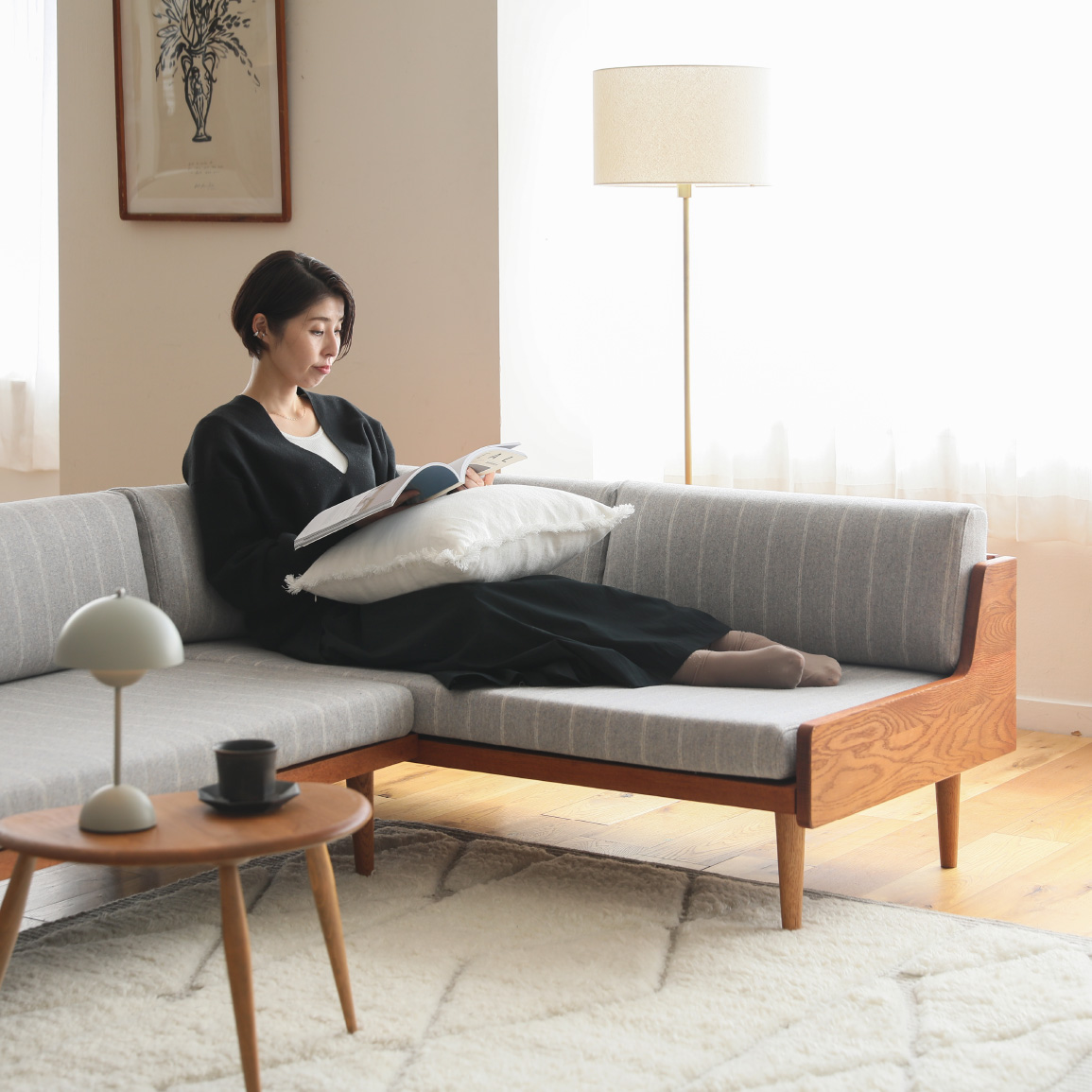 Couch sofaコンパクトだけど豊かな居心地が魅力。それぞれの場所でゆったりと過ごせるカウチソファーです。2人暮らしや、ご夫婦と小さなお子様のような家族構成のご家庭におすすめなサイズ感で、十分に広い座り心地。さらに、脚を伸ばして座れるので、カウチならではのリラックス感も楽しめます。