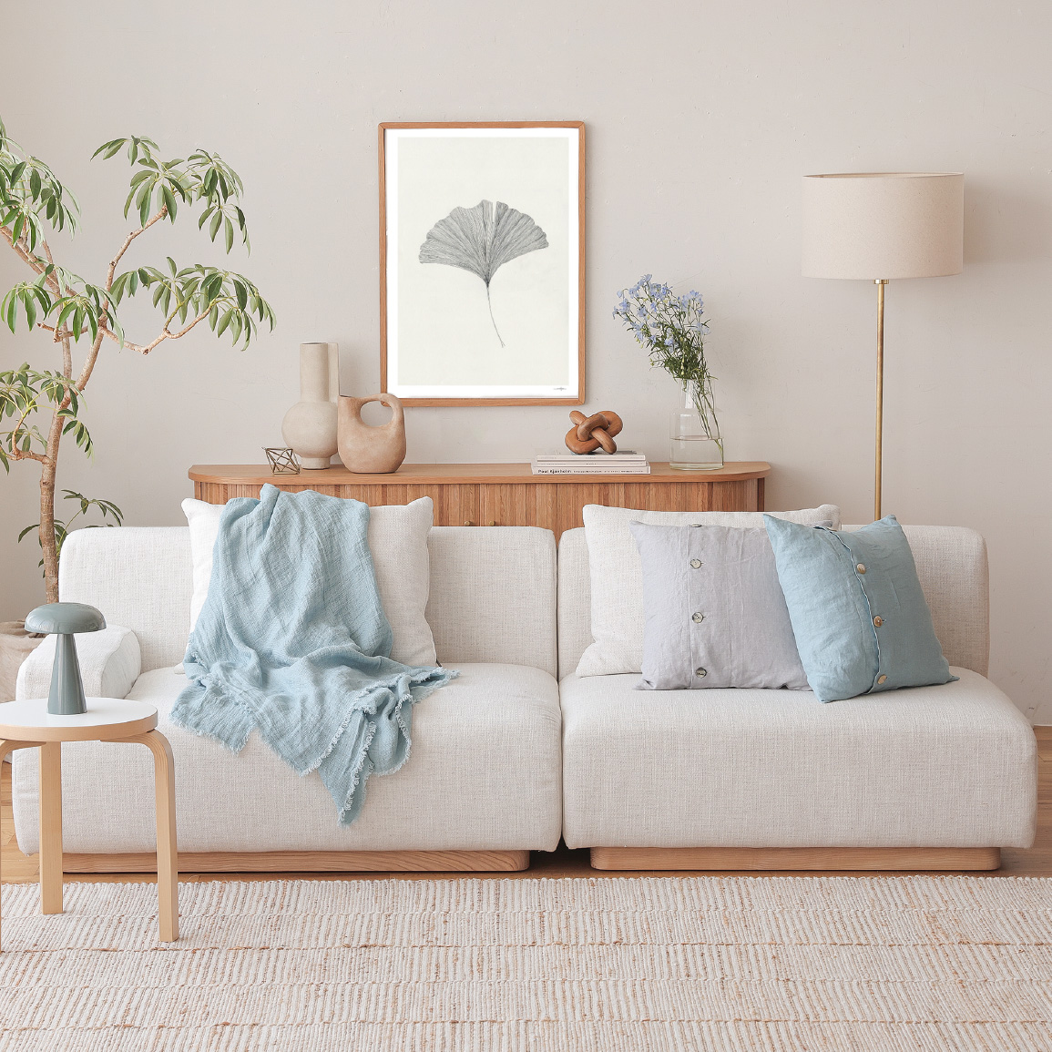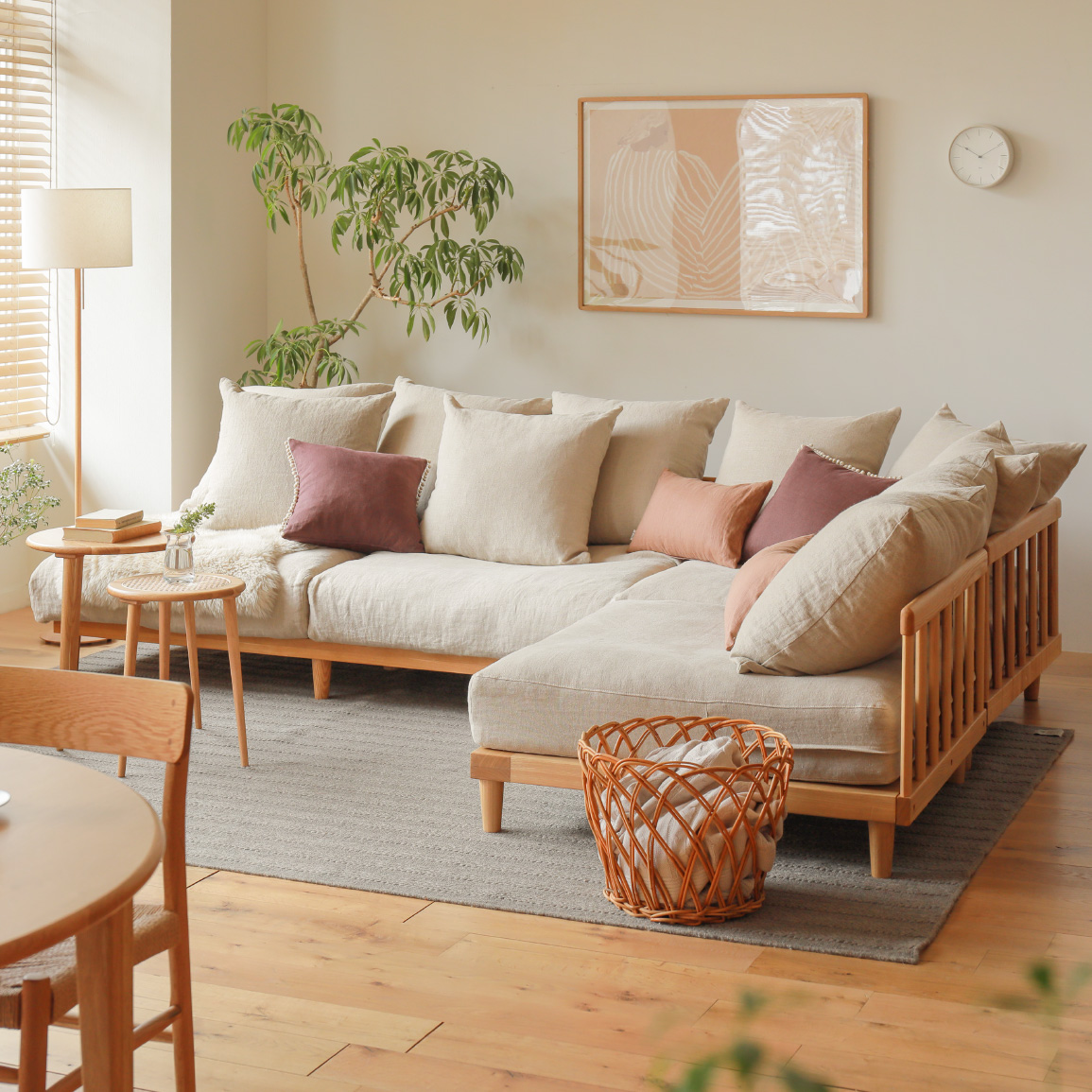 ソファー自体がシンプルのため、色あざやかなクッションやブランケットなどのアイテムを合わせていただくと、色味を美しく引き立ててくれます。
