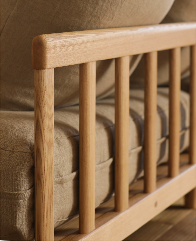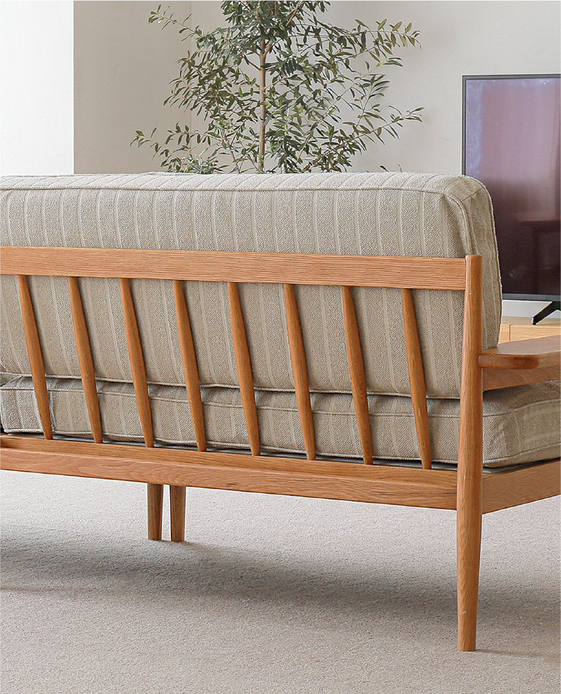 後ろ姿にもこだわりを持っており、ソファーの後ろを支えるスポークには、円柱に膨らみをもたせた形の「エンタシス」を採用。洗練された印象に仕上げました。