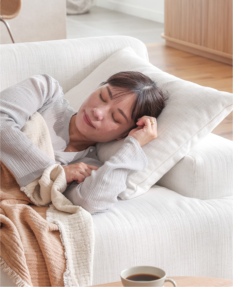 ソファーで横になってくつろぎやすいように、アームに小さな傾斜をつけています。頭にちょうどよくフィットするので、「置きクッション」を使えば、お昼寝にも最適。