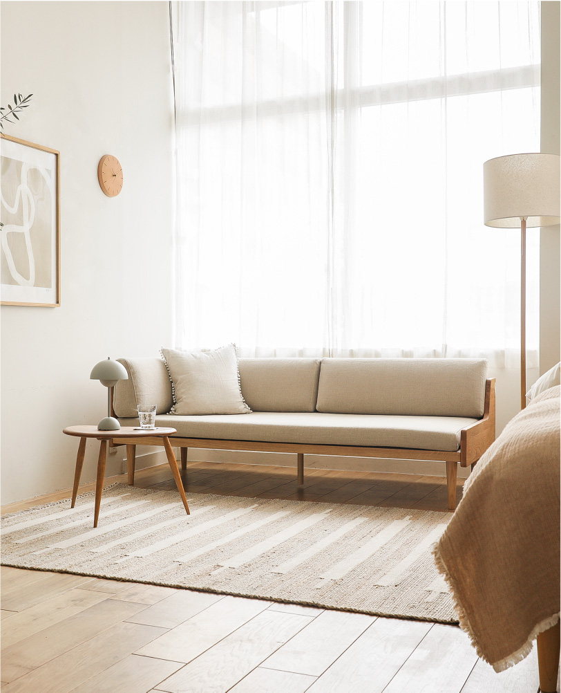 明るいベージュカラーの木製家具やフローリング、自然素材のラグの中に「Class」の洗練さが加わることで、美しい「ナチュラルモダン」スタイルに。