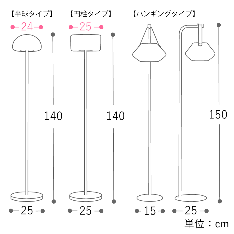 「140cm」「150cm」は、一般的なフロアライトの高さ。