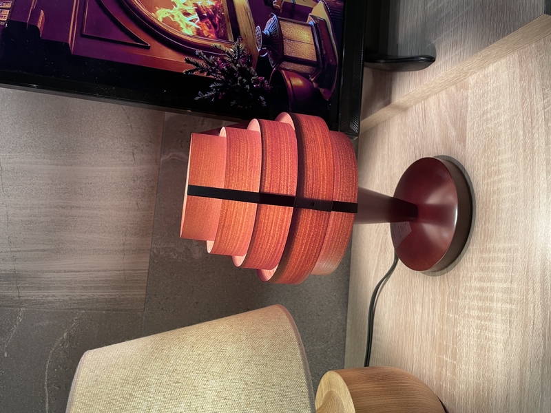 消えている時は、凹凸に光が当たることで陰影ができて立体的に。点いている時は、スライスされたパインに光が透け、木目の濃淡が強調されてシルエットが浮かび上がります。