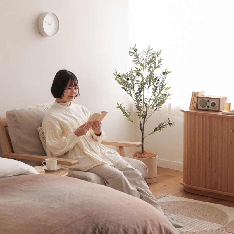 落ち着いたトーンのオリーブは、くつろぎの場である寝室にぴったり。存在感が強すぎないので、さりげなく寄り添い、癒しを与えてくれます。