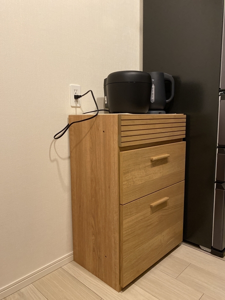 耐荷重10kgのスライド棚で、毎日使う家電もスムーズに出し入れできちゃいます♪ ※画像は「Rekit ガラスオープン扉60」と「Rekit オープン引出60」