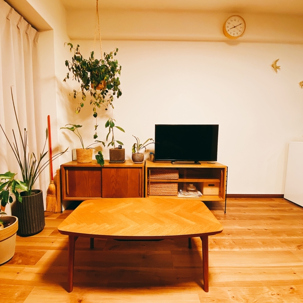 テレビボードやオープンラックの上など、お部屋の所々にグリーンを置くと明るい空間になります。1人掛けのソファーの前にこたつを配置すれば、さらにリラックス度の高い時間を過ごせそう。