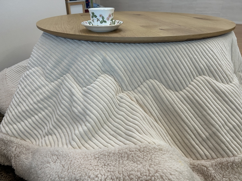 「薄掛けタイプは寒いのではないか?」と心配する方がいるかもしれませんが、布団がテーブルに沿うようにして裾の広がりを抑えてくれるので、身体にぴったりフィット。