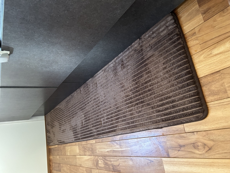 続いて、45cm×180cmサイズのキャメルカラー。キッチンマットという名前ですが、サイズ的にベッドサイドにぴったりで、このような使い方もおすすめ。