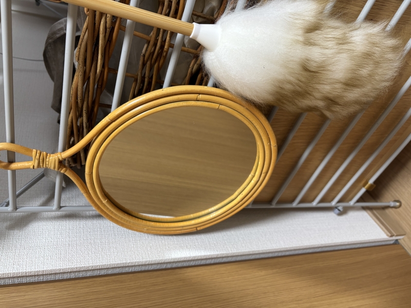 持ち手はフックにもなるので、玄関の壁にかけて使うことで、お出かけ前の簡単な身だしなみチェックをすることも。