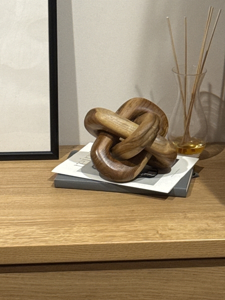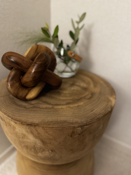 職人の手で削り出された滑らかな曲線や、こっくりと深みのあるチークウッドの色合い、独特のフォルムがもたらす立体感...。