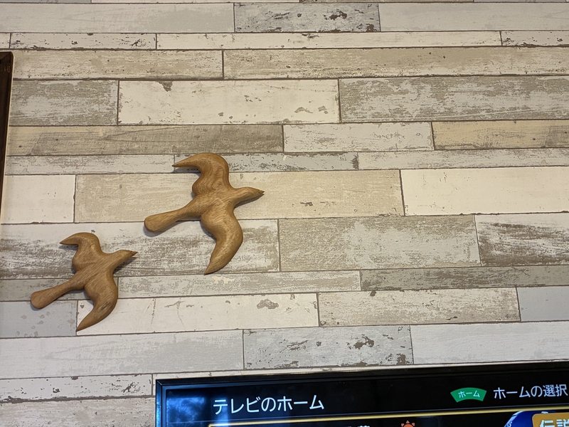 木の温もりを感じるやさしい表情の鳥たちが、まるで壁を自由に飛んでいるようで眺めていて癒されます。