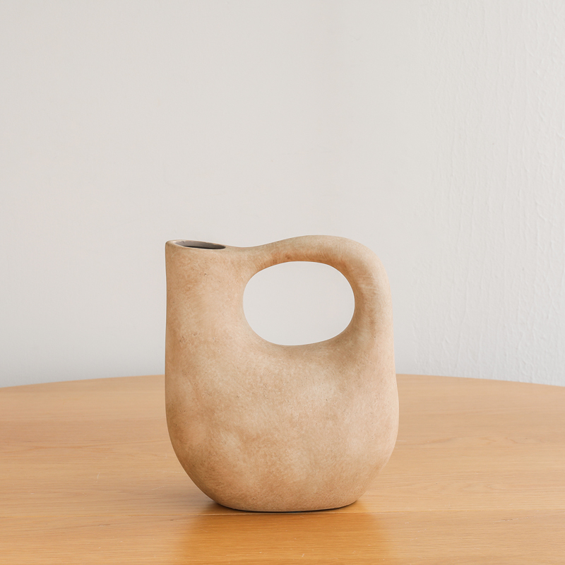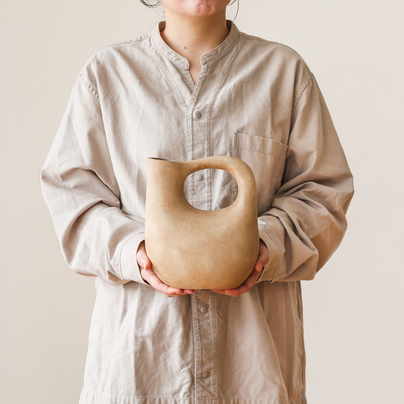 ぽってりと丸みのある形状が可愛らしく、取っ手のようにくり抜かれたデザインが目を引きます。