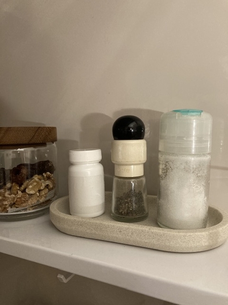 大きめのサイズ感ながら、ストーン調の質感が空間に自然と馴染むため、無造作に置いても「整って見える」のがポイント。洗面所のスキンケアボトル置きとしてもおすすめです。