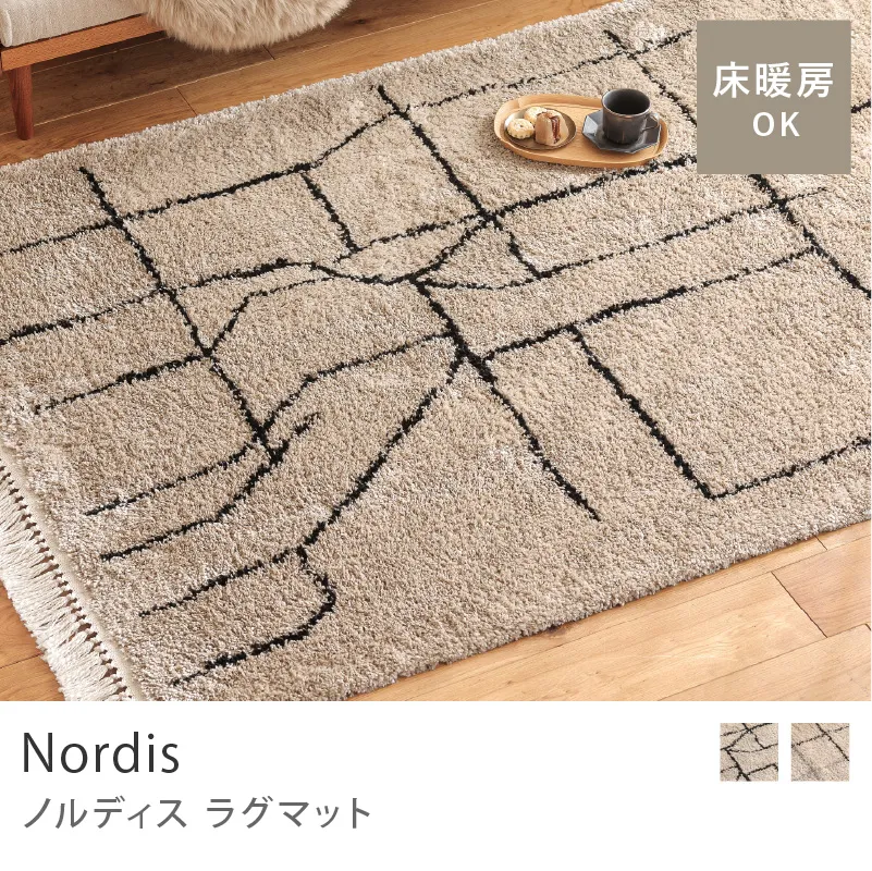 思わず触れたくなるような厚みが心地よい、「ラグマット Nordis(ノルディス)」。 立体感のある柄と、へたりにくい耐久性の高さが特徴です。