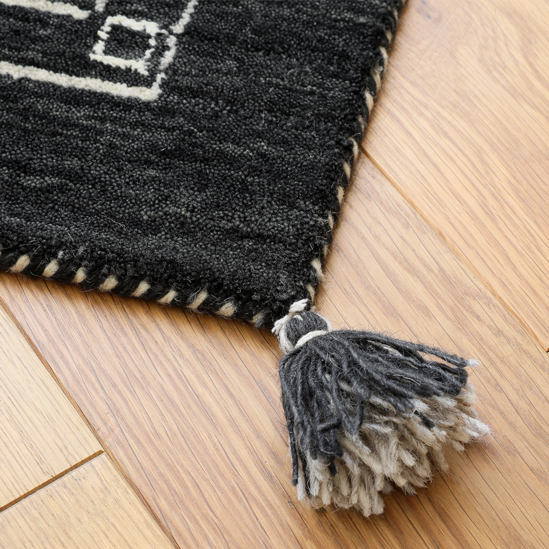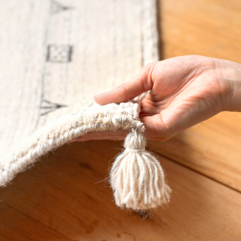 さらに、ラグマットの四隅にあしらわれたフリンジとサイドの織り模様がなんとも目をひくデザイン。