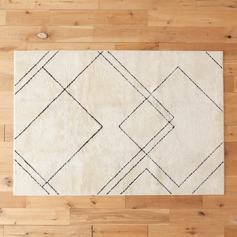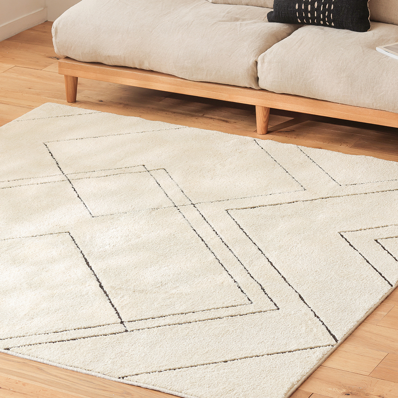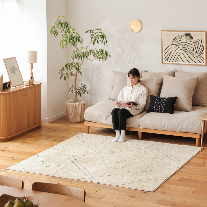 柄のあるラグマットを取り入れたいけれど、空間を明るく、広くみせたいという方におすすめのアイテムです。