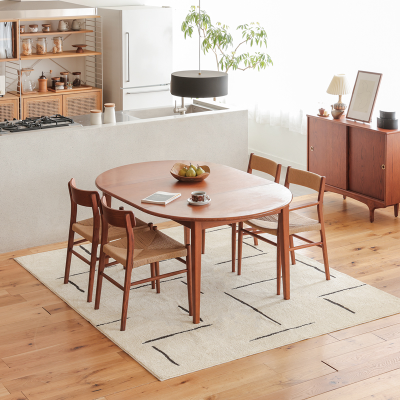 こちらのサイズなら、一般的な4人掛けのダイニングセットがまるっと収まります。ダイニングラグとしてお迎えいただく場合、「テーブルサイズ+60~70cm」を目安に、サイズをご検討いただければと思います。