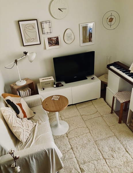 リセノでは、リビングのラグマットを選ぶとき、ソファーの横幅より少し大きめのサイズを推奨しています。重心が下がることで、より落ち着きのある空間を作れるからです。