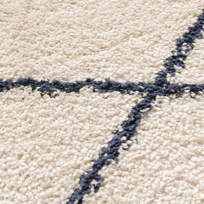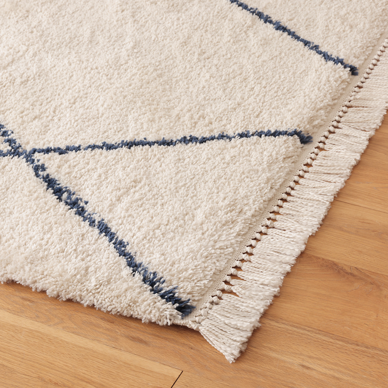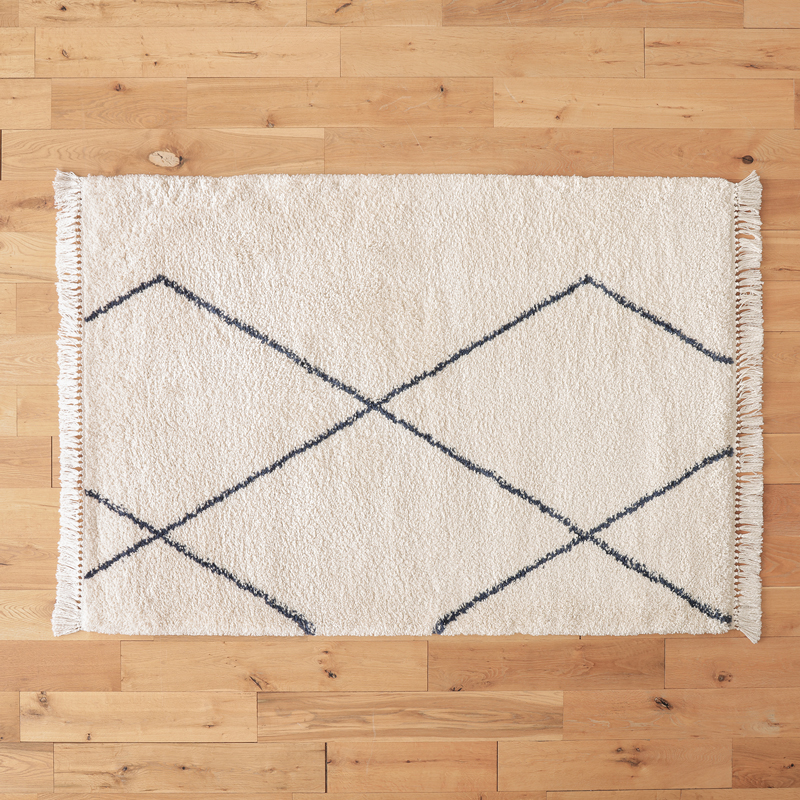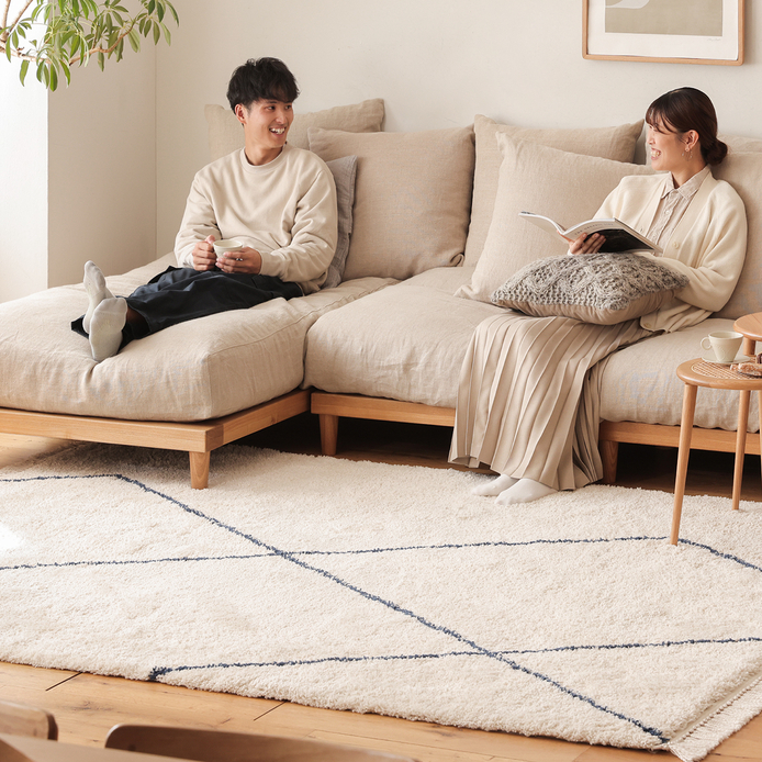 そんな憧れのベニワレンラグを、もっと身近に楽しめるように生まれたアイテムです。アイボリーカラーがお部屋をパッと明るくしながら、ブラックのラインが空間をほどよく引き締めてくれます。