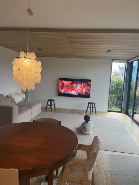 大きめのラグマットとしての使い方がおすすめです。ソファーからテレビボードまでをしっかりとカバー。リビングテーブル周りでお子さんが遊んだり、勉強することもあると思いますが、そんなときも広々とお使いいただけます。