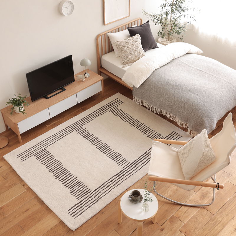 一人暮らしのお部屋にラグマットを敷くことで、くつろぐスペースと、食事や作業をするスペースをゆるやかに区切り、メリハリをもたらしてくれます。