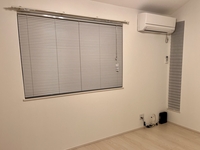 After(画像1枚目):ブラインドを取り付けて眩しさがかなり解消されました。ブラインドにすると室内のトーンが均一になって部屋全体が広く見えるような気がします。