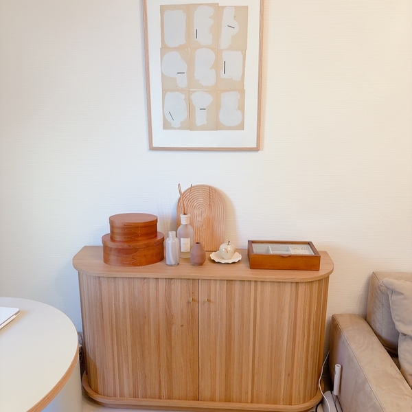 引っ越しが多いため、今まで収納家具を1つも持たずに備え付けの収納で何とかやり過ごしていましたが、リセノさんのYouTubeで、生活同線上に収納家具があったほうがお部屋も片付くことを学び、動画に登場していたタンブールの可愛さに魅了されて、絶対買いたい!と思い購入しました。