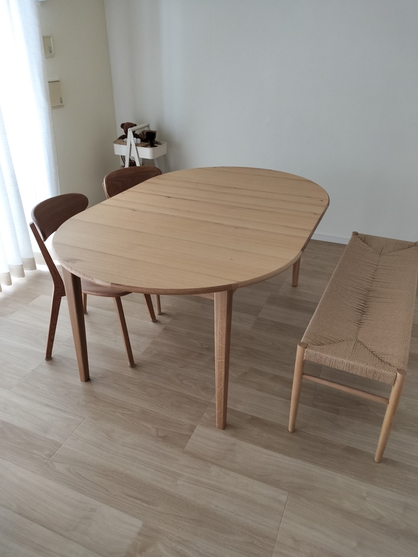 楕円の状態だとこれまで使用していたテーブルより一回り大きくなるので、圧迫感が出ないか心配していましたが、丸みのある形のおかげか全く圧迫感はありません。