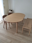 普段は4人家族で暮らしており、夫婦2人子ども2人で座るのには円形で十分です。お客様が来られる時だけ楕円形に伸ばして使っています。大人が2人いれば簡単に伸ばせますし、1人でもできます。省スペースで過ごせるので普段は部屋を広く使うことができます。6人でゆったりと座れますし、小さい子どもなどであれば詰めて横側に3人座ることもできます。間取り的にダイニングテーブルの位置は通路も兼ねているので普段は小さく収まっているのはとても有り難いです。お客様にもいつもびっくりされて、その机良いねといっていただけています。作りもしっかりしているのでとてもオススメです。どんどん値上がりしているので、検討されている方は早めに買った方がお得だと思います。シリーズの違うラタンの椅子と組み合わせて使ってますが似た色の木を使っているので統一感があるのもお気に入りのポイントです。