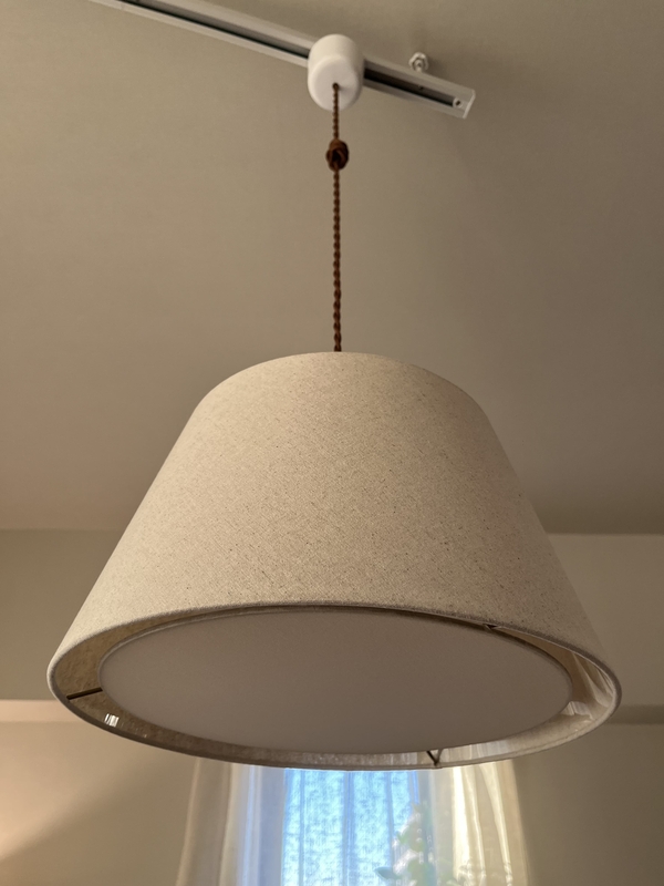 電源コードからシェードまでが、シンプルなデザインなのですが、素材感がしっかりしていて、非常に気に入ってます。できればスマート電球にして調光が出来るようにした方が、シーンに合わせて光の調節ができるので良いかと思います。