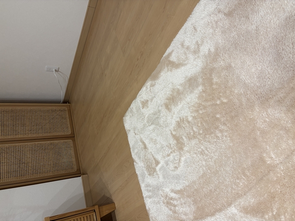 ふわふわで気持ちが良く、適度に厚みがあるため床の硬さも気になりにくくよかったです。ミルクティーカラーにしましたが、ピンク味の入った柔らかいベージュでとてもいい色で気に入りました!ピンクが強すぎないので、浮くことなくフローリングに馴染んでくれます。