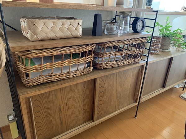 リビングでよく使う細々したものを入れたことで雑多な印象が無くなり、天然素材のあたたかい印象がプラスされました。