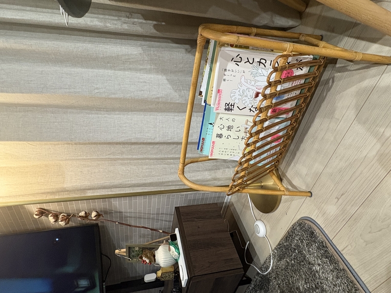 雑誌や本は読みかけのまま、あちこちに放置しがち。ざっくりでも一箇所にまとめてあるだけで、お部屋は片付いて見えます。