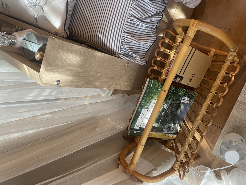 寝室での使用例。ソファーサイド同様ベッドサイドに置いてあると、本を読みながらゴロゴロとリラックス。眠たくなったらマガジンラックにざっくりと放り込んで、そのまま眠りにつくなんてことも。