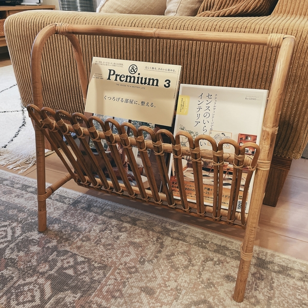 「ラタン(籐)」という天然素材の特性を活かした「マガジンラック JUGLAS (ユグラ)」。塗装はしておらず、ラタン本来が持つ色味や自然にできたムラをそのまま活かすことで、個性豊かな表情となっています。