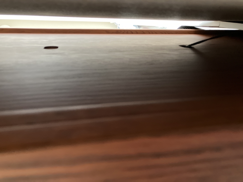 画像のように、天板自体は突板仕様にしておき、棚の先端部分にだけ、無垢材をプラスすることで、この船底仕様を実現しています。