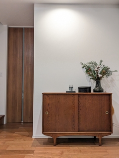 キャビネット自体のスペースを取ることなく、中には可動棚があるため細々とした物の収納に助かっています。