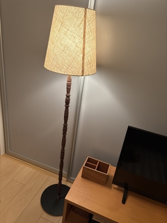 ショップで見て、ウォールナットのスタンド部分、マットなブラックの台座、麻のシェード、