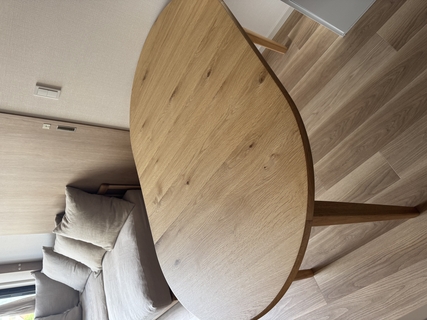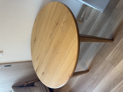 新築に、ダイニングテーブルは丸テーブルが絶対欲しくて、ネットで沢山見て探し、こちらを購入。結果大正解です! 120cm、家族4人でもしっかり間もとれて、窮屈にはなりません。色味もかわいくて、床の色や別で購入した椅子ともぴったりあいました。家に来る方も、みなさん褒めてくださります。作りもしっかりしていてお値段以上です。本当に買ってよかったです!