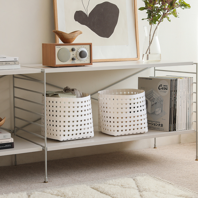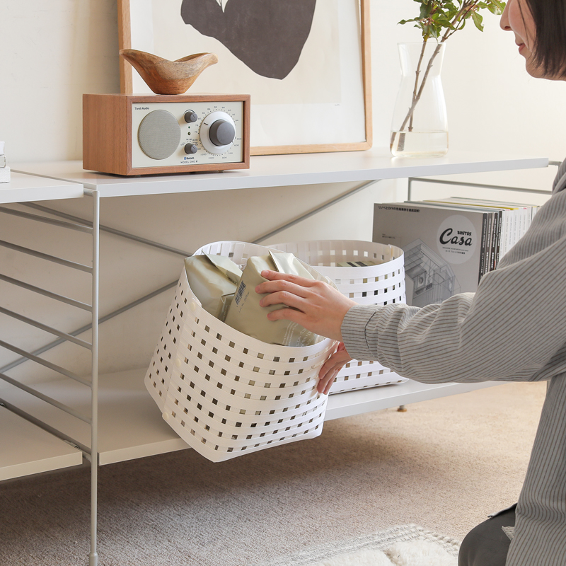 コーヒーセットや食料など、ストック類をガサッといれておくのにおすすめ。編み目の隙間から、なにが入っているのか確認しやすいから、家族みんなが困らない収納ができます。
