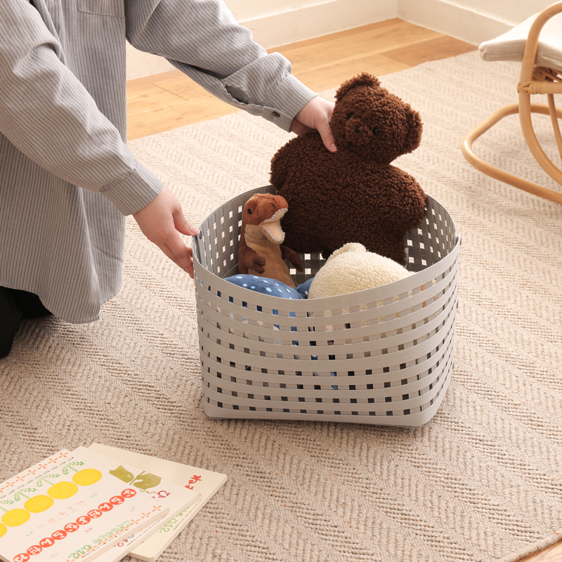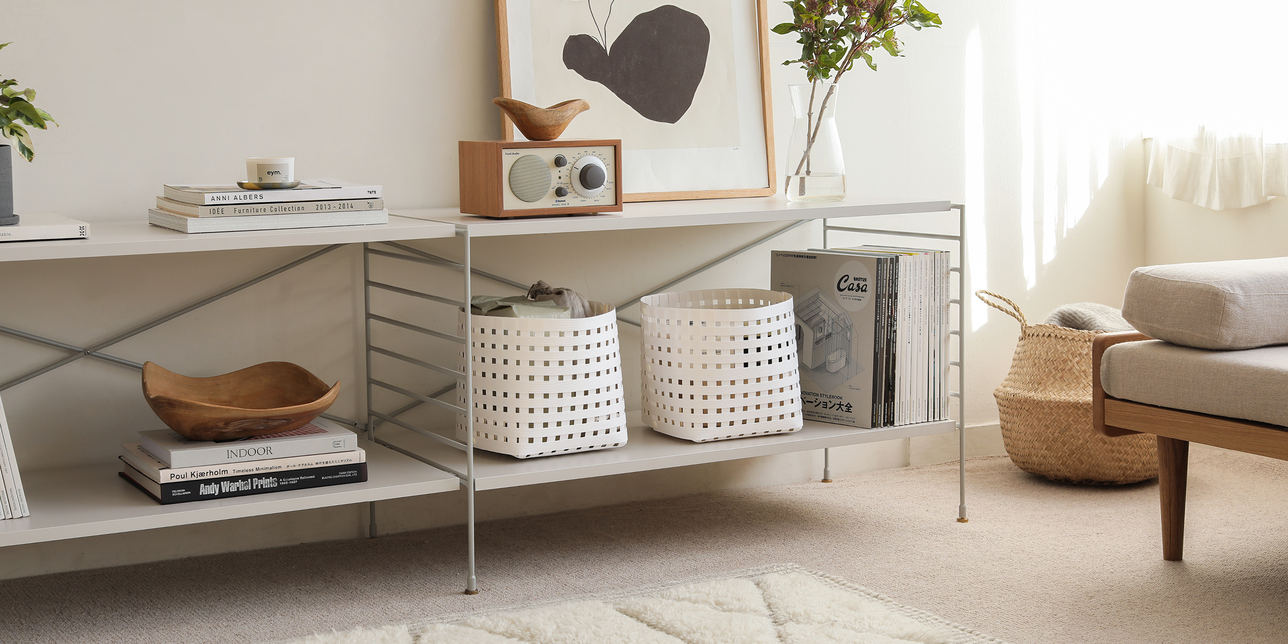 そんな片づけられない問題の救世主となるのが「バスケット」。散らかりがちな小物たちをバスケットにポンポンつめれば、この通り。