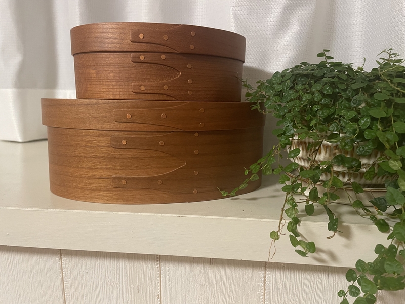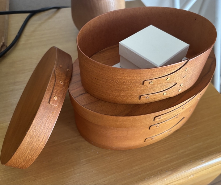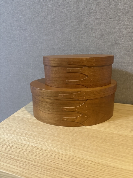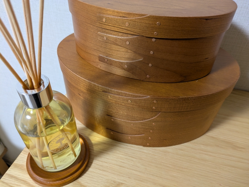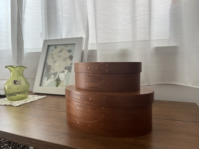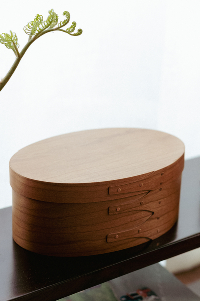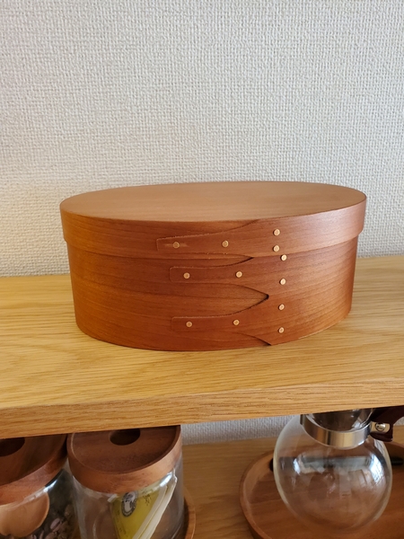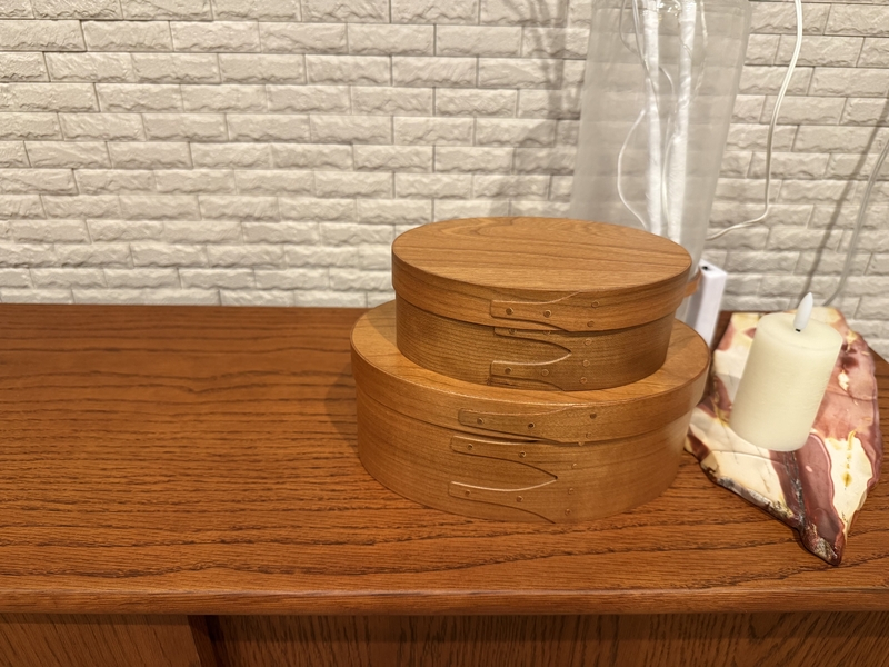 シェーカーボックスは、曲げ木の滑らかな曲線の美しさと、木製ならではの温かみを感じるデザイン。側面の木材を留めるツバメの尾のような仕立てと、真鍮のリベットからは、手作業の跡のような素朴な雰囲気を感じます。