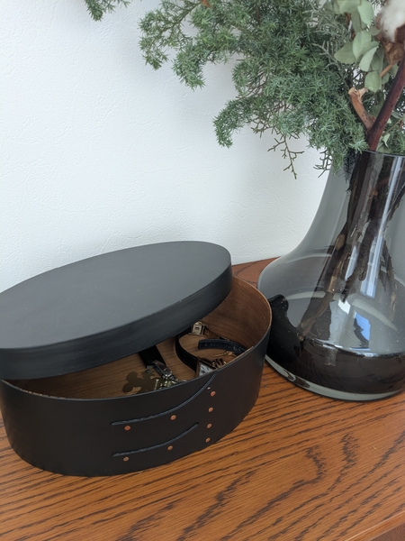 シェーカーボックスは、曲げ木の滑らかな曲線の美しさと、木製ならではの温かみを感じるデザイン。側面の木材を留めるツバメの尾のような仕立てと、真鍮のリベットからは、手作業の跡のような素朴な雰囲気を感じます。