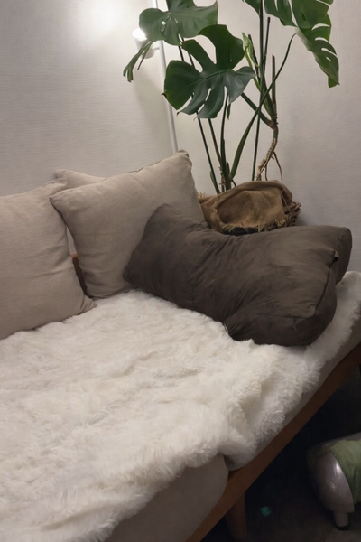 AGRAは簡易なベッドとしてもお使いいただけますし、座面にブランケットを敷いておけば、使う方も使ってもらう方も、汚れに対して気兼ねなくいられるのでおすすめです。