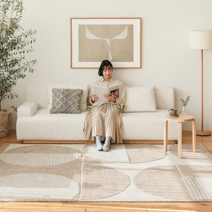 明るいベージュカラーの木製家具やフローリング、自然素材のラグの中に「Class」の洗練さが加わることで、こちらも美しい「ナチュラルモダン」スタイルに。