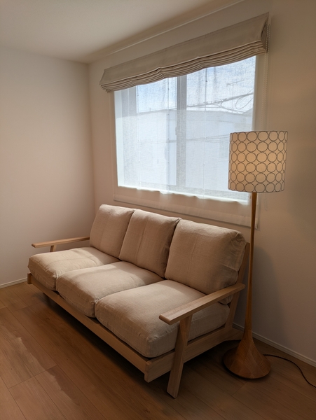 窓際にピッタリ設置しましたが、背もたれの木枠が斜めになっている為かサイドからの見映えがゆとりある様に見えますし、座面もしっっかりしていて広いので3人で座ってもリラックスできます。